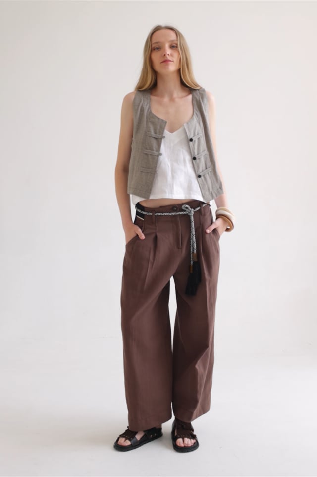 Chaleco de escote a la base y fit recto , ideal para usar sobre tops, blusas y vestidos. Tiene una silueta minimalista de lineas rectas que hacen de esta prenda un accesorio para terminar cualquier look. Tiene 3 botones forrados y ojales de la misma tela con un diseño decorativo.