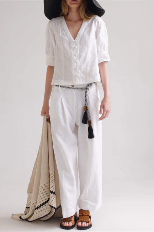 Confeccionado en lino 70 % + algodón 30 % .Estilo effortless con un toque sofisticado.